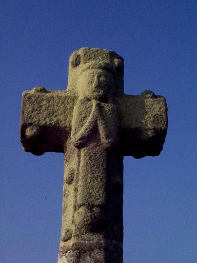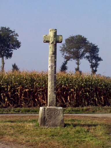 Une des belles croix de la commune, ici à fût écoté, avec un décor sculpté : la Vierge et le Christ, portant l'inscription : IHS MA sur plusieurs côtés du socle et G PAVMIER SA COMPAIGNE 1650 et IHS sur les bras de la croix.