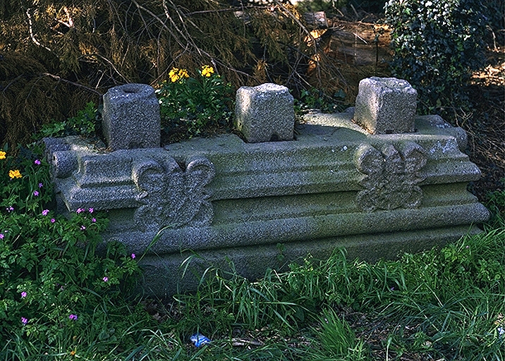 Fragments de croix sculptées dans le granite : un piedestal portant les traces de trois croix brisées, un socle quadrangulaire surmonté une haute croix, des fragments figurés.