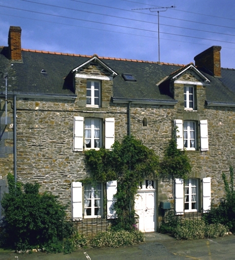 Au sein d'un alignement aspecté vers la place centrale du bourg, cette maison à deux travées centrées fait figure de demeure cossue d'un notable rural. C'est ce qu'annonce la belle porte d'entrée aux deux battants de bois sculpté portant les initiales RL entrelacées du commanditaire. L'emploi de grès ocre dans les encadrements de baies, peu commun dans ce pays schisteux est un autre élément remarquable.