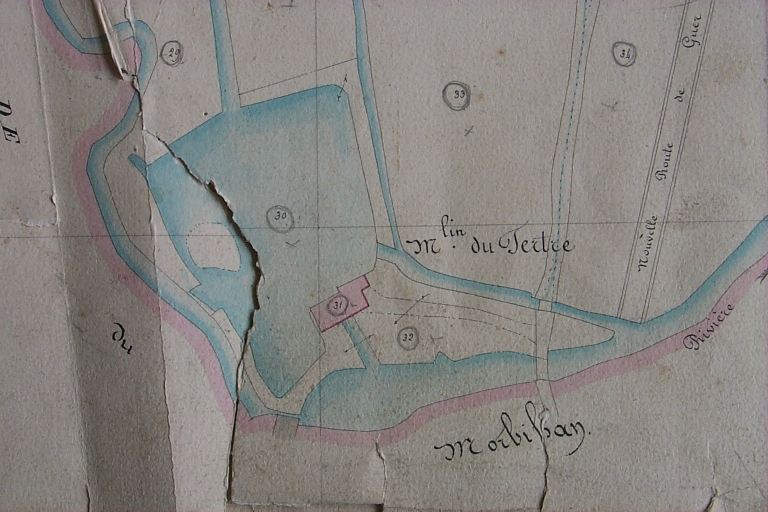 Probablement dépendant et contemporain du château homonyme situé sur la commune voisine de Guer qui porte la date 1851, le moulin du Tertre est un beau spécimen de ces grandes minoteries de l'ère industrielle. Depuis une retenue pratiquée en bordure de l'Aff, un bief amenait l'eau ; à l'intérieur de la bâtisse, les deux grandes roues de bois - dont il ne reste que les moyeux - activaient à leur tour le mécanisme de fonte encore en place. Signe d'une prospérité passée, un corps en équerre a été ajouté au sud ainsi que des logements sans doute destinés au minotier et sa famille. Ces quelques éléments descriptifs joints au gabarit imposant de l'édifice en font un témoin exceptionnel dans la commune.