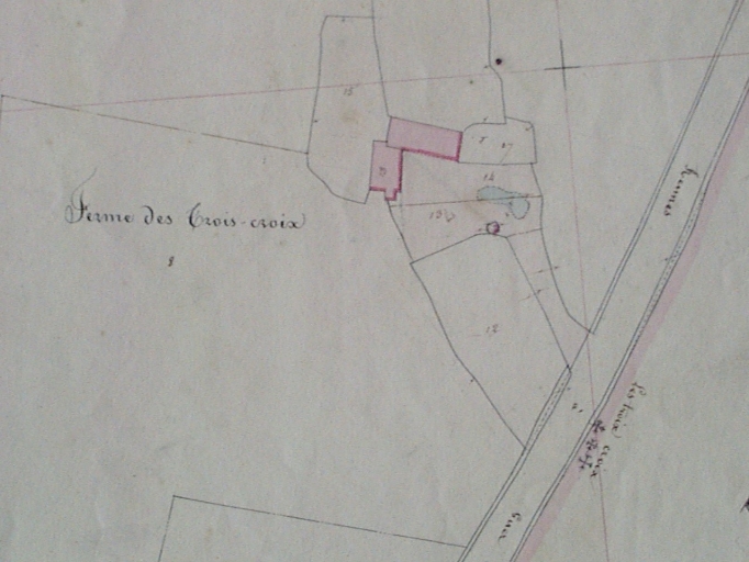 Le cadastre de 1830 mentionne bien ces trois croix, mais de l'autre côté de la route, au sud ouest de leur actuel emplacement, sur le territoire de la commune de Mernel. Elles ont sans doute été déplacées lors des travaux d'élargissement de la route. Cette disposition peu commune, semblable à celle d'origine, évoque la scène du Golgotha : le Christ entre les deux larrons.