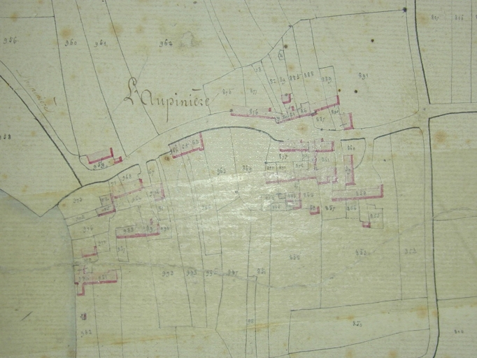 Feuille cadastrale de la section B2 dite du bourg. Levée par Couppé géomètre, 1828, échelle 1/2500e. (A.D. Ille-et-Vilaine : 3 P 5361).
