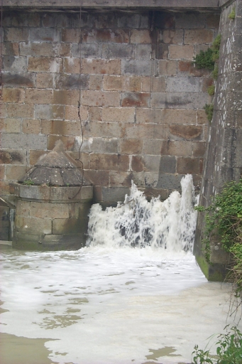 Ouvrage dessiné par l'ingénieur des Ponts et Chaussées Dorotte en 1774-75 ; projet et travaux poursuivis par l'ingénieur Piou en 1778. Equipé de vannes (à bascule, verticales et à deux vantaux), le pont empêche la remontée de la marée, dans le Biez Jean comme dans le Biez Brillant ; une cale associée permettait les déchargements.
