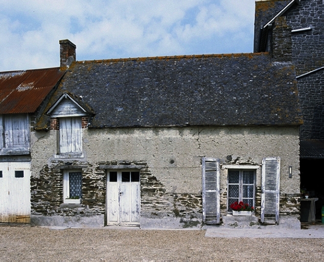 Modeste logis élémentaire en pisé de tangue élevé sur un solin en moellons de schiste ; exemple de l'architecture en terre malheureusement en voie de disparition