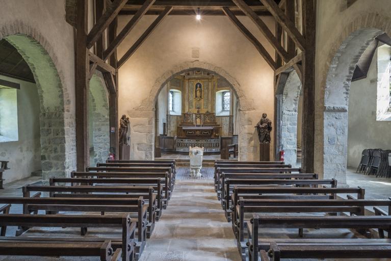 Église romane à l'origine à trois vaisseaux. Agrandissement sur les côtés du chœur de deux chapelles décalées puis transformation des bas-côtés. Arc diaphragme en place. Chevet refait à pans coupés. Clocher médian en charpente.