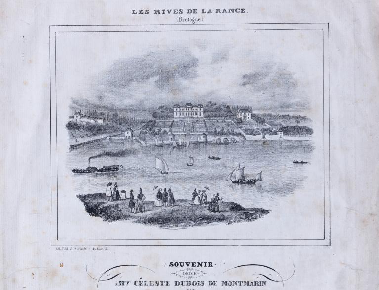 Vue du château de Montmarin, de sa rade, son port et de son bassin. Gravure de Barjolle, "d'après le tableau original de 36 pouces de largeur sur 26 de hauteur qui est dans le cabinet du Roi 1787". (Coll. part. ; B.N., Cabinet des Estampes).