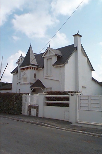 Petite maison de villégiature d'inspiration néogothique, ornée d'un décor en relief donnant l'appellation de la villa et sa date de construction : M KORRIGANE 18B9P4.