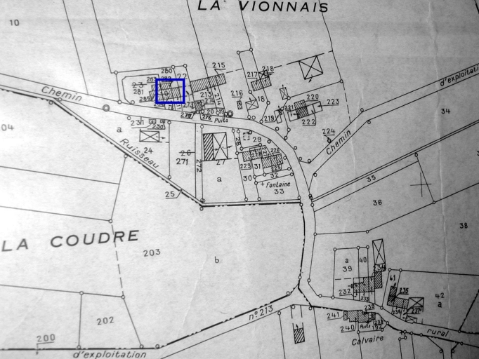 Un bon état de conservation et la date de construction inscrite sous la niche à Vierge font de ce logis un élément de référence pour l'étude en cours. Caractéristique de l'habitat rural de la région en 1823, il est composé de deux pièces chauffées juxtaposées (une cuisine et une chambre) et possède un cellier dans l'appentis postérieur. C'est sans doute autour de 1900 que la fenêtre ouest fut remaniée. La pièce à l'est qui possède toujours sa cheminée dut être transformée en étable à cette époque. Noter les linteaux filants à arcs segmentaires.