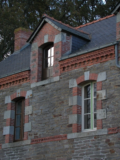 Grand logis de ferme de composition ternaire ; la brique joue un rôle décoratif déterminant dans une mise en oeuvre de grande qualité. Appentis postérieur à usage agricole. Ouvrage comparable à quelques variantes près à un ouvrage contemporain à Landrouais.