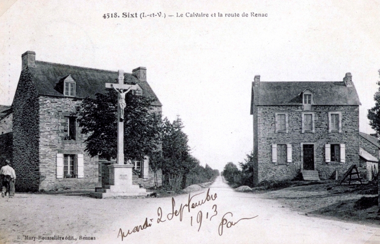 4518. Sixt (I.-et-V.) - Le calvaire et la route de Renac, carte postale, E. Mary-Rousselière édit., Rennes, début 20e siècle (collection particulière).