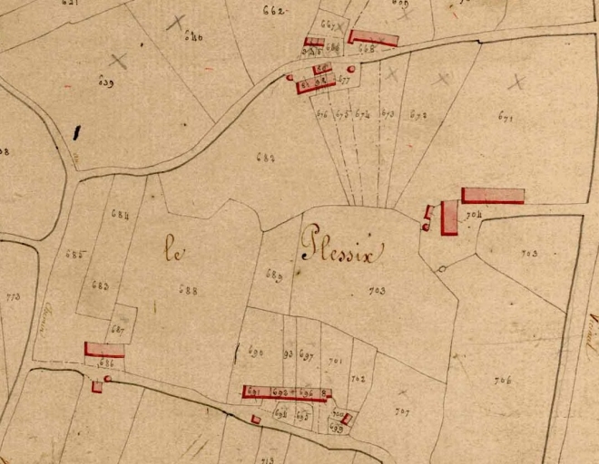 Plan cadastral napoléonien. Section C dite du Plessix, 2e feuille. Levée par M. Cheval, géomètre, 1826, échelle 1/2500e. (A.D. Ille-et-Vilaine).