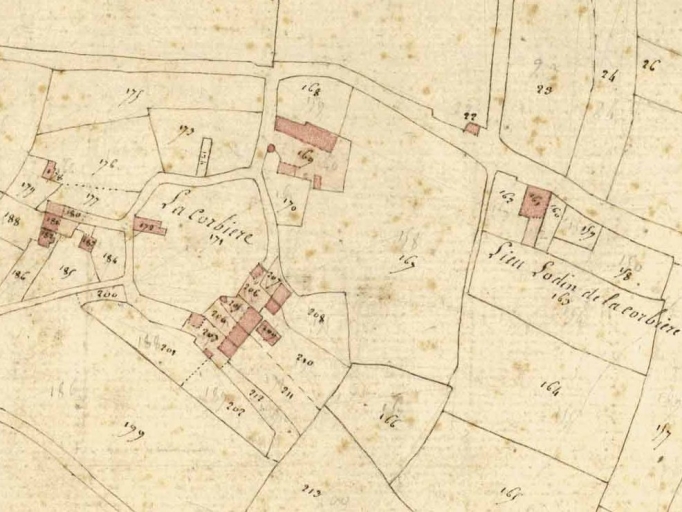 Le lieu-dit des Corbières était autrefois divisé en deux entités,la “Petite Corbière” et la “Grande Corbière”, ensemble plus important..sur le cadastre de 1826, on observe tout un agglomérat de bâtiments concentrés autour d’une aire plane. Le lieu mentionné sur la carte de Cassini En 1750 pourrait être lié à l’abbaye..Le site d’une aire plane. Le lieu mentionné sur la carte de Cassini En 1750 pourrait être lié à l’abbaye.