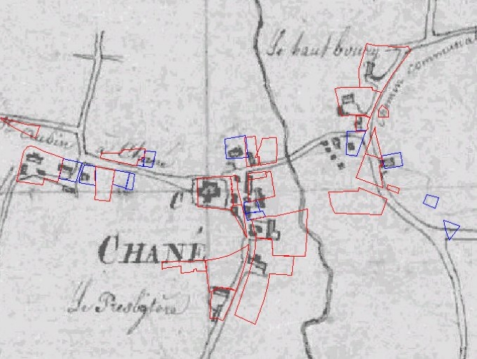Le village, à l'exception de la rectification de la voie menant au Haut Bourg à l'Est, n'a pas connu de grandes modifications de structure urbaine depuis la réalisation du premier cadastre en 1826 ; peu de nouvelles constructions notables furent réalisés jusqu'au milieu du 20e siècle. Les ouvrages représentés en rouge sur le plan annexé sont documentés [voir la liste ci-dessous]. Les ouvrages représentés en bleu sont très fortement remaniés depuis leur édification avant et après la réalisation du cadastre en 1826.