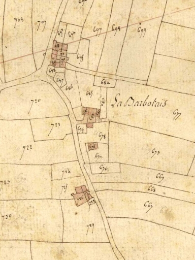 Les ouvrages représentés en bleu sont très fortement remaniés depuis leur édification avant la réalisation du cadastre en 1826. Les ouvrages non cernés sont détruits.