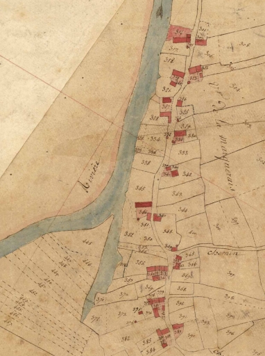 Feuille cadastrale de la section B2 dite de la Riauté. Levée par Beuscher, géomètre, 1818, échelle 1/2500e. (A.D. Ille-et-Vilaine : 3 P 5557).
