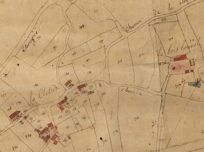 Feuille cadastrale de la section A1 dite du bourg. Levée par Beuscher, géomètre, 1818, échelle 1/2500e. (A.D. Ille-et-Vilaine : 3 P 5557).
