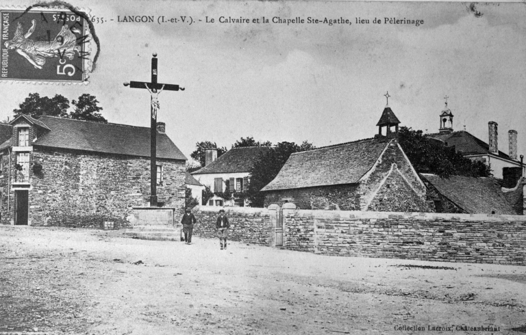 635.- LANGON (I.-et-V.). - Le Calvaire et la Chapelle Ste-Agathe, lieu de Pèlerinage. Carte postale collection Lacroix, Châteaubriant [s.d], (Archives départementales d'Ille-et-Vilaine : 6 Fi).