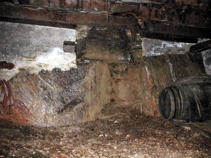 Logis ancien construit sur le rocher dont le foyer est creusé dans la carrière. Solive portant poutres sur le mur gouttereau arrière.