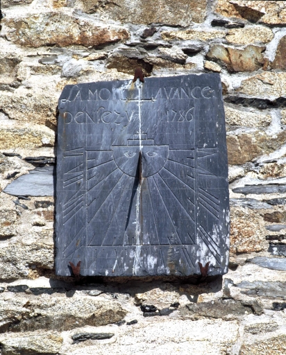 Inscription sur le cadran solaire : "La mort avance / pensez-y. 1786". Inscription sur le linteau de la porte d'entrée (façade nord) : "1551 [croix] I RH".