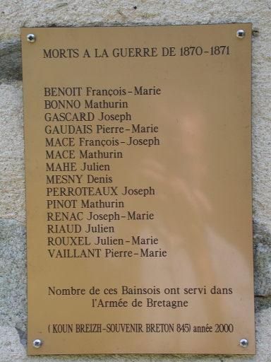 Inscriptions gravées sur la croisée : "BASILIAN 1888 M.M." La plaque commémorant la bataille de Ballon est datée de 1983. Le monument aux morts de la guerre de 1870-1871 est daté de 2000.
