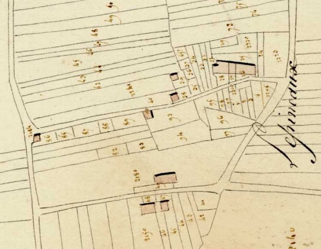 Plan cadastral dit napoléonien. Section G dite de Trobert, 10e feuille du n°2551 au n°2726, échelle 1/1000e, Levée par Morin Géomètre Seconre, 1843. Archives départementales d'Ille-et-Vilaine, Rennes.