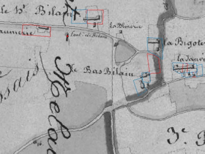 Les 2 ouvrages représentés dans un cadre rouge à droite sur le plan annexé sont documentés. Les 4 ouvrages en bleu sont très fortement remaniés, dont un ouvrage daté 1921, depuis leur édification avant et/ou après la réalisation du cadastre de 1847. L'écart est principalement composé d'un ensemble de logis formant une 'rangée'.