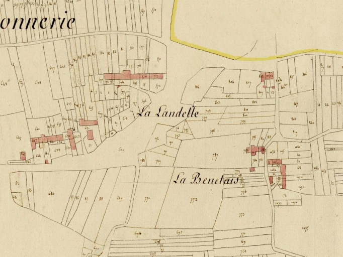 Ille-et-Vilaine. Commune de Bains, canton de Redon. Section K, feuille 1, plan cadastral napoléonien, sous la direction de M. Naylies, ingénieur vérificateur, 1817, échelle : 1/2500e. (A.D. Ille-et-Vilaine).