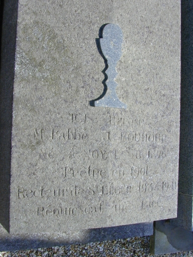 Le calice sculpté en bas relief indique la qualité ecclésiastique du défunt. Sur la dalle, on lit l'inscription suivante ICI REPOSE/M. l'abbé J. BOUDOUR/Né à NOYAL le [?] 08 1876/Prêtre en 1901/Recteur de St Léger 1906-1911/Requiescat in Pace.