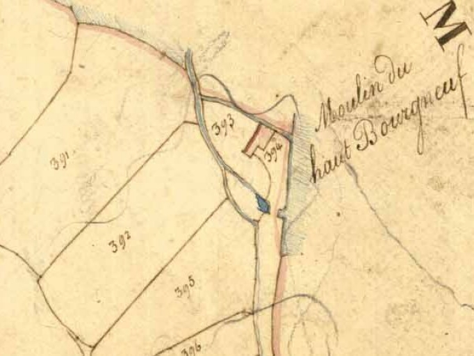 Plan cadastral napoléonien. Section A dite du BOURGNEUF, 1ère feuille, échelle 1/2.500 Levée par Roger. Archives départementales d'Ille-et-Vilaine 3P.