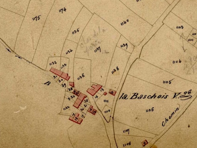 Feuille cadastrale de la section E2 dite de la Ricolais, par Legionnel géomètre, [1827], échelle 1/2500e (A. D. d'Ille-et-Vilaine : 3 P 5532).