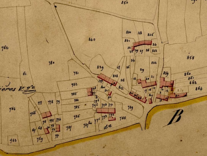 L'alignement réunit une série de logis, à deux niveaux de greniers sur salle unique, caractéristique d'une forme d'habitat communautaire à cour partagée assez bien représenté à l'échelle communale. L'ensemble figuré sur le cadastre de 1827 a été reconstruit dans la deuxième moitié du 19e siècle. La ferme en partie en terre à l'extrémité Est est plus ancienne.