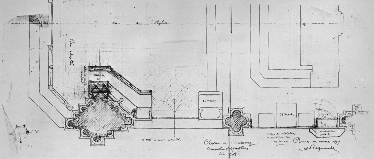 Eglise de Combourg. Plan Plume, encre de chine, encre rouge, mine de plomb, aquarelle et gouache sur toile vernie par Arthur Regnault architecte, 1878 (A.D. Ille-et-Vilaine : série O 1017/4).