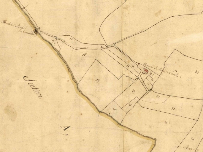 Feuille cadastrale de la section B1 dite du Bourg, par Lesné géomètre, [1824], échelle 1/2500e (A. D. d'Ille-et-Vilaine : 3 P 5415).