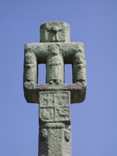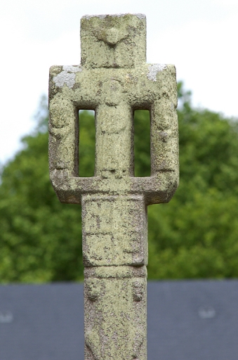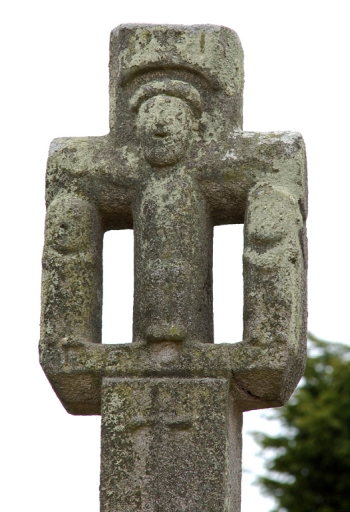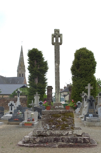 La croix du 16e siècle s'élevait dans l'ancien cimetière à l'emplacement actuel de la statue du Sacré Coeur de Jésus au sud ouest de l'église. Elle porte la figure du Christ en croix surmontant les armoiries des Monterfil de sable à l'épée d'argent, la pointe en bas sur la face est ; au revers, la Vierge(?) surmontant les armoiries des Monterfil avec leurs alliances.