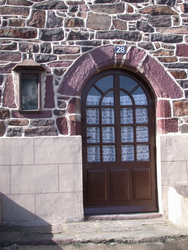 Maison avec un encorbellement en façade. Niche à statue de la vierge. Cheminée sur mur gouterreau.