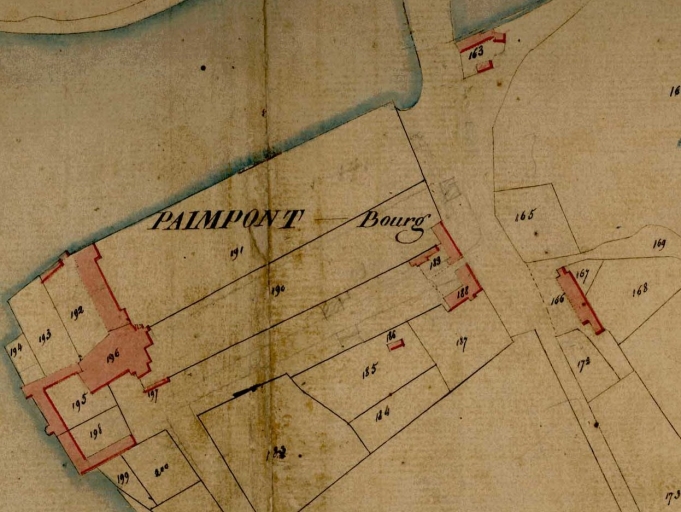 L'agglomération paimpontaise ne prend véritablement naissance qu'après la sécularisation du périmètre de l'abbaye ; le cadastre de 1823 est sans équivoque, il ne figure pas encore les premières constructions civiles, les maisons en série construites quelques années plus tard. Elles offraient probablement un logement à une partie du personnel de l'établissement industriel situé au village des Forges. Une inscription datée concernant un commanditaire est portée sur l'actuel syndicat d'initiatives figuré parcelle 197 sur le cadastre de 1823 : FAICTE PAR / MI[?]P[?]ACE / 1610.