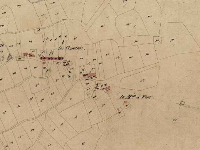 Le hameau du Moulin à Vent est cité par Marteville et Varin, continuateurs de Jean-Baptiste Ogée, comme l'un des principaux écarts de la commune au milieu du 19e siècle. La disposition du bâti a très peu changé depuis 1823 (date du premier cadastre). Dix ouvrages y ont été identifiés comme étant antérieurs à 1940 (limite chronologique du présent recensement). Trois seulement présentent un état de conservation satisfaisant motivant l'ouverture d'un dossier individuel.