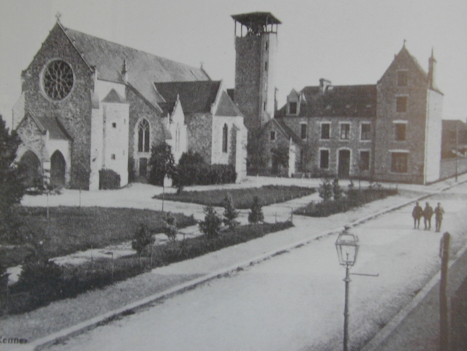 [1920 ca]. Eglise des Sacrés-Coeurs et prison départementale, carte postale, 1er quart 20e siècle, in Rennes et pays de Rennes en 1900, Cesson : Jean-Luc et Jean-Marie Boure éditeurs, Mémoire photographique de notre siècle, 1992.