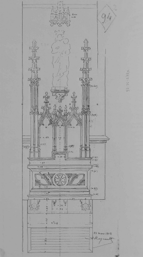 [1914]. Eglise du Sacré-Coeur. Autel Notre-Dame de Bellevoisin, dessin, par Arthur Regnault, 23 mars 1914 (A. D. Ille-et-Vilaine).