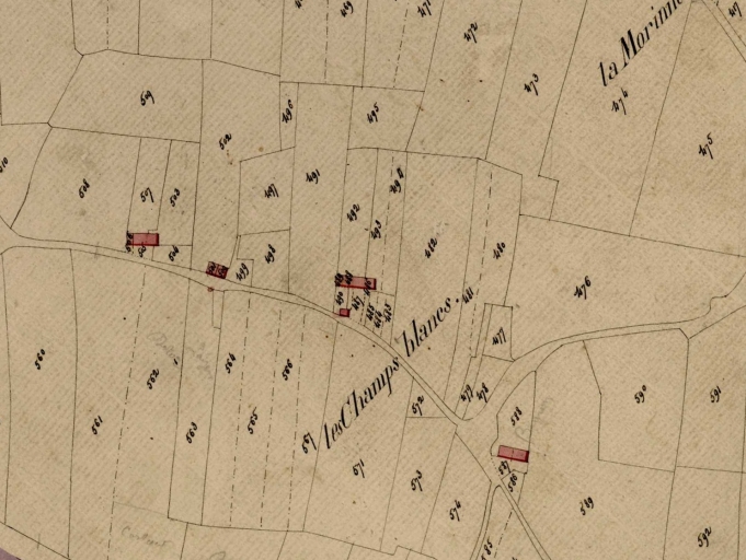 Le hameau des Champs Blancs est cité par Marteville et Varin, continuateurs de Jean-Baptiste Ogée, comme l'un des principaux écarts de la commune au milieu du 19e siècle. Il compte aujourd'hui parmi les villages de petite taille. Sept ouvrages y ont été identifiés comme étant antérieurs à 1940 (limite chronologique du présent recensement). Cinq présentent un état de conservation satisfaisant motivant l'ouverture d'un dossier individuel.