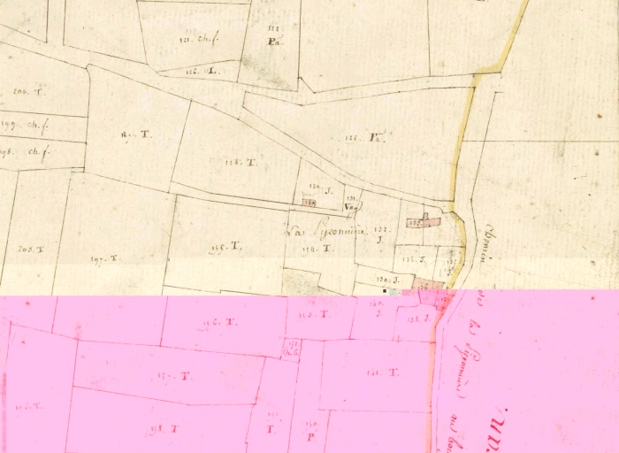 Ille-et-Vilaine. Commune de Saint-Germain-du-Pinel. Plan cadastral dit "napoléonien". Section B dite du Bourg, plan cadastral, 1810, échelle : 1/2 500ème (A.D. Ille-et-Vilaine : 3 P 5497).