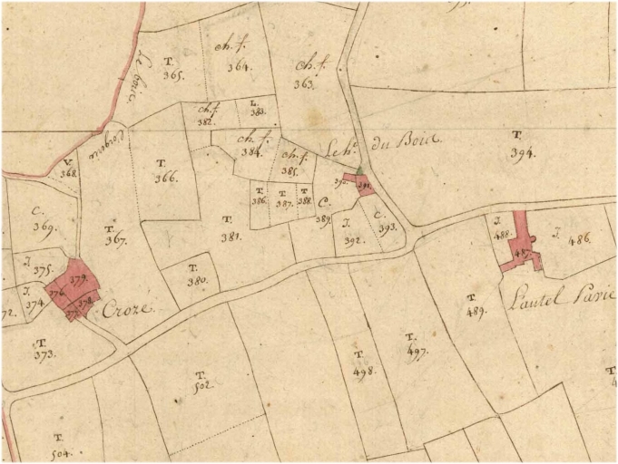 Plan géométrique parcellaire de la commune de Vergéal, section A dite du Bourg, par Geslin géomètre, Colliot arpenteur, Michel Robin maire, terminé le 15 décembre 1810, échelle 1/2500e (A. D. d'Ille-et-Vilaine : 3 P 5574).