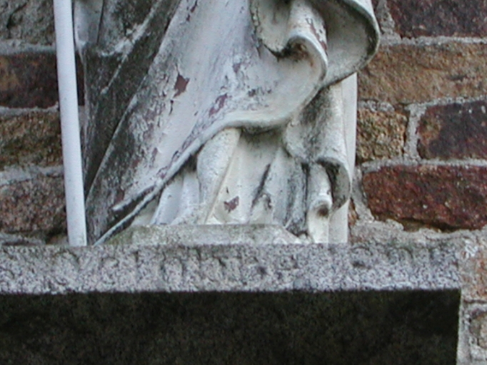 L'ancienne école Saint-Méen présente sur son mur nord la statue d'un saint constructeur offrant sur la base à peine lisible la date .. Octobre 1895[?].