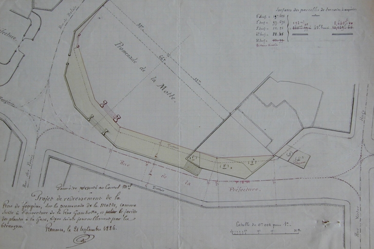 La promenade de la Motte est l'une des promenades aménagées à Rennes, dans la 2e moitié du 17e siècle, après celle du Mail. Son rôle attractif au début du 18e siècle, après la reconstruction de la ville, se manifeste par les projets de rénovation et d'agrandissement dont elle fait l'objet. Le projet de Mousseux (1729), se présente sous la forme d'un cours, qui épouse les contours de l'enceinte, prolongé jusqu'au futur port de Viarmes. Celui de l'ingénieur de la ville Abeille (1739) se libère de la contrainte topographique pour adopter un plan régulier où les plantations suivent un tracé en ellipse sur la grande motte, distincte de la petite motte dotée d'un parterre. Ce choix s'explique par la création d'une seconde promenade, au port de Viarmes.