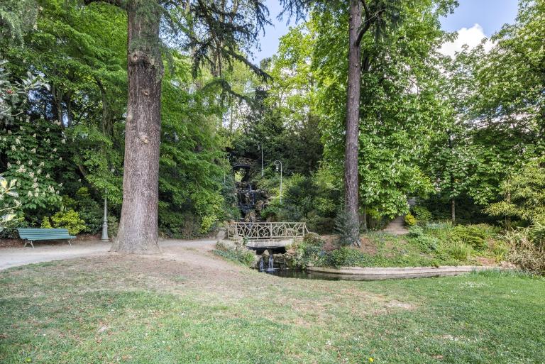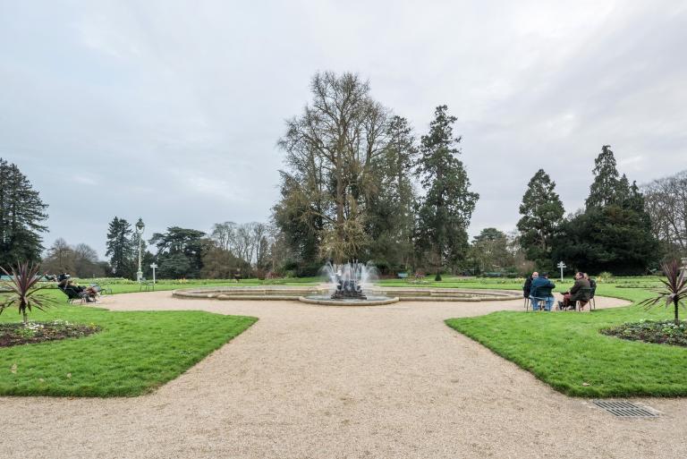 Les premiers aménagements comprennent l´érection d´une statue de Duguesclin par Molcknecht (1825) puis de la colonne monumentale honorant la mémoire de Vanneau et Papu, réalisée sur les plans de l'architecte communal Charles Millardet (1835). Après l´agrandissement réalisé en 1862 et 1864 (Noury, 1997), le paysagiste Denis Bühler dessine les plans du jardin (1866 et 1868). Plusieurs aménagements sont réalisés sur les plans de l'architecte communal Jean-Baptiste Martenot : les serres et l'orangerie (1862-1863) remplaçant deux serres chaudes construites en 1807 (Noury, 1997), qui se situent, selon J.-Y. Veillard, dans la lignée des œuvres de Ch. Rohault de Fleury. L.-M. Noury mentionne deux projets non réalisés pour les serres, ceux de Leroy en 1844 et d´Aristide Tourneux en 1851. L´architecte communal dessine également la grille formant la nouvelle entrée sur le parvis de Saint-Melaine, version simplifiée de celle du parc Monceau, de Davioud, également exécutée dans la fonderie Barbezat, en 1874 ; les plans du kiosque (1875), de la volière et de la ménagerie (1876). Le jardin est doté de bancs publics (1871), d´une conciergerie (1872), d´un manège et de latrines (1883).