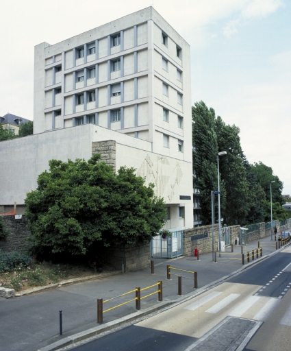 L'édifice est construit sur une parcelle en fort dénivelé. Au sud, bordant la rue de Paris, se situent une conciergerie et un corps de bâtiment à étage de soubassement et deux étages carrés, construit en briques creuses avec ossature en béton armé, masquées par un carrelage mural. A l'est, un pavillon en rez-de-chaussée surélevé sur étage de soubassement est construit en moellons de schiste masqués par un enduit tyrolien. Un gymnase lui fait face, à l'ouest. Au nord du pavillon se trouve un corps de bâtiment de plan en U, en rez-de-chaussée surélevé sur étage de soubassement et deux étages carrés et étage de comble (fig. 7). Au nord de la parcelle s'élève un corps de bâtiment de plan en U construit en maçonnerie, avec ossature en béton armé, masquée par un enduit (fig.8).