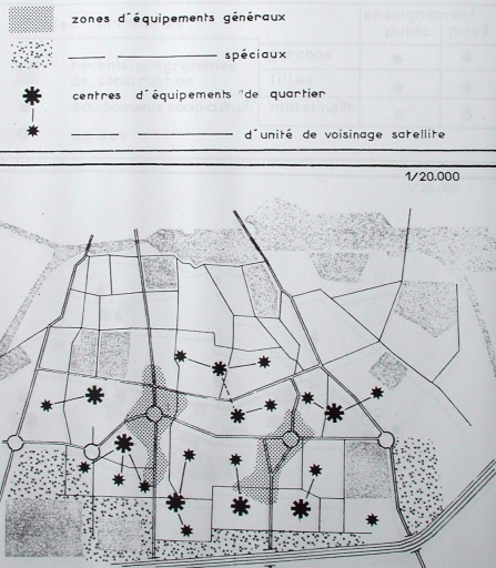 L´ensemble des logements collectifs, dont l´unité est la résidence, est à l´origine conçu par groupes d´immeubles formant eux-mêmes des unités de voisinage dans lesquelles s´intègrent également des logements individuels. Ceux-ci, peu nombreux (10%), sont disposés à la périphérie, au sud et au sud-ouest. A l´origine, le quartier ouest regroupe trois unités de voisinage composées de logements collectifs, le quartier est compte trois unités de voisinage, dont deux mixtes, le quartier centre en compte quatre, dont deux mixtes. Ces unités de voisinage ne coïncident pas avec les îlots, elles sont distribuées par des voies secondaires et des dessertes d´îlot. Les programmes de logement ne coïncident pas avec les îlots.