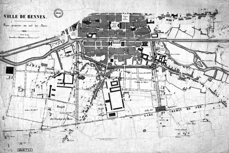 [1855]. Plan de la ville de Rennes, rues proposées au sud des murs, 1855 (A. C. Rennes ; 1 Fi 75).