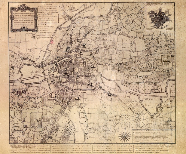 [1806 ca.]. Plan de la ville de Rennes et de ses faubourgs dédié à monsieur Caze baron de la Bove, levé par Forestier l'aîné, gravé et réduit par Ollivault, 1783, réédition de 1806 (A. D. Ille-et-Vilaine ; 5 Fi 4).