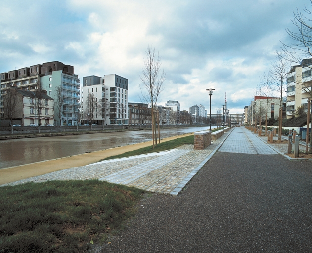 Comme l´indiquent les ouvrages de François-Xavier Merrien et de Claude Nières, le privilège accordé à la ville par François Ier, en 1539, inaugure les travaux destinés à améliorer la navigation sur la Vilaine entre Redon et Rennes. Dix écluses y sont construites entre 1575 et 1585. Dans la ville, l´écluse du moulin de la Poissonnerie est construite en 1610. En 1668, M. de Nointel signale que la rivière difficilement navigable ne servait qu´au transport des denrées de nécessité. Jusqu´à Redon, circulaient des bateaux de 20 tonneaux, de Redon à Messac, le lit peu profond ne permettait que le passage de petites barques de 5 tonneaux, enfin entre Messac et Rennes, le transport s´effectuait sur de grandes barques de 15 tonneaux. Depuis Redon étaient acheminés des vins de Bordeaux et de Nantes et des matériaux de construction (tuffeau de la Loire, ardoises de Fougeray, bois de la forêt du Gâvre, chaux, sable et pierres de Pont-Péan. Depuis Vitré, le trafic est moins important, ce sont essentiellement des matériaux de construction, au début du 18e siècle, au moment de la reconstruction de la ville. Au début du 18e siècle, Gabriel considère qu´elles sont trop éloignées les unes des autres et mal entretenues. Des travaux seront réalisés pour permettre l´approvisionnement des matériaux nécessaires à la reconstruction de la ville ; un port est aménagé à l´est de la ville et deux nouvelles écluses sont construites, celle de Joué et celle de Saint-Hélier. La canalisation de la Vilaine, dans la traverse urbaine, est projetée par l´ingénieur du roi Robelin, au moment de la reconstruction de la ville haute, après l´incendie de 1720. Le plan de redressement dressé en 1722 est rendu exécutoire par un décret du 12 avril 1725. Le tracé, figuré sur le plan Forestier de 1726, prévoit la reconstruction du pont de la Poissonnerie et du pont de Toussaint, la construction de deux ponts supplémentaires, l´un dans l´axe du Parlement, en lien avec la création d´une place au sud, l´autre, dans l´axe de la rue de Rohan. Seul, le pont Saint-Germain est conservé. Le plan de 1830 figure le pont de Berlin, construit en prévision de la canalisation de la rivière. En 1837, le conseil municipal adresse une demande au ministre du Commerce et des Travaux publics pour la construction de cales et de quais nécessaires aux besoins du commerce. Une étude préparatoire est réalisée par l´ingénieur Coiquaud sous la direction de Robinot, en 1838, puis de Lord sous la direction de Guichard et de Le Pord. Les travaux débutent en 1841 ; les quais sont construits en 1843, entre le pont de Nemours et le pont de Berlin (quai Lamartine et cale du Pré-Botté) et prolongés, en 1846, à l´ouest jusqu´au pont de Chaulnes (quai Lamennais) et à l´est jusqu´au pont Saint-Georges (quais Châteaubriand et quai Emile-Zola) ; ils s´achèvent en 1861, après la destruction de l'ancien hôpital Saint-Yves (quai Duguay-Trouin). Le canal, compris entre deux quais de 10 mètres, a une largeur de 25 mètres. La rivière est profondément encaissée ; trois cales sont prévues, au centre et à chaque extrémité du bief, associées à quatre escaliers, de manière à augmenter les pôles de déchargement, malgré la demande du conseil municipal qui espérait la construction d´une cale à chaque pont. Trois nouveaux ponts sont construits pour relier la ville haute et la ville basse : le pont de Nemours, reliant les rues de Rohan et de Nemours, le pont Napoléon III, qui remplace le pont de Chaulnes, enfin le pont Pasteur, qui remplace le pont Saint-Georges. Trois ponts sont supprimés : le pont Saint-Yves, ceux de la Poissonnerie et de l'Ille, enfin l'ancienne passerelle Saint-Germain. La construction des quais entraîne également la suppression du moulin de la Poissonnerie et l'inutilité du canal de dérivation, baignant les murs de la ville basse, qui sera comblé pour devenir le boulevard de la Liberté. Le prolongement, à l'ouest, sera réalisé sous le Second Empire, après la construction du pont Napoléon III en 1861, qui remplace le pont de Chaulnes, suivant un tracé oblique par rapport à l'axe des quais. Le prolongement, à l'est, du Mail-Donges au gué de Baud, sera effectué en 1848, au moyen d'une simple levée de terre. Le quai de Richemont, dont la construction est votée en 1861, n'est effectivement visible que sur les plans de 1880. La cale du Pré-Botté, aménagée en 1843, sera supprimée en 1880, étant donné le rôle secondaire de son trafic, inférieur à celui des cales de Saint-Cyr et de la Prévalaye et du port du Mail. Après la rectification des quais, on y construira le palais du Commerce. Le canal est comblé entre 1911 et 1913, entre le pont de Nemours et le pont de Berlin, où un jardin public est aménagé devant le palais du Commerce, puis entre le pont de Nemours et le pont Napoléon III, enfin dans le bief de la Chapelle-Boby, entre la rue Leconte-de-l´Isle et l´avenue François-Château, pour permettre la construction d´une voie rapide.